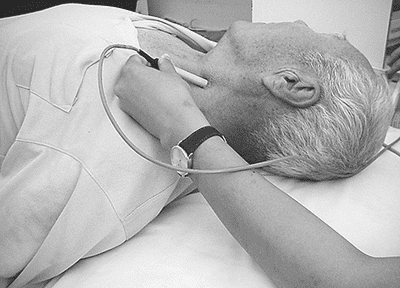 位于枕部的骨性標(biāo)志枕骨粗隆下方,發(fā)際上1cm左右,探頭置于枕窗中央部朝向枕骨大孔或置于兩旁(枕旁窗)。經(jīng)枕窗檢測時受檢者一般取坐位,頭頸部放松稍向前屈,下頜略向胸部抵近。病情危重或行動不便者也可采用側(cè)臥位,同樣將下頜抵向胸前,保持頭頸部的前屈位置。通過枕窗及枕旁窗可以檢測雙側(cè)椎動脈(VA)和基底動脈(BA),也能檢測小腦后下動脈(PICA),但不夠恒定.